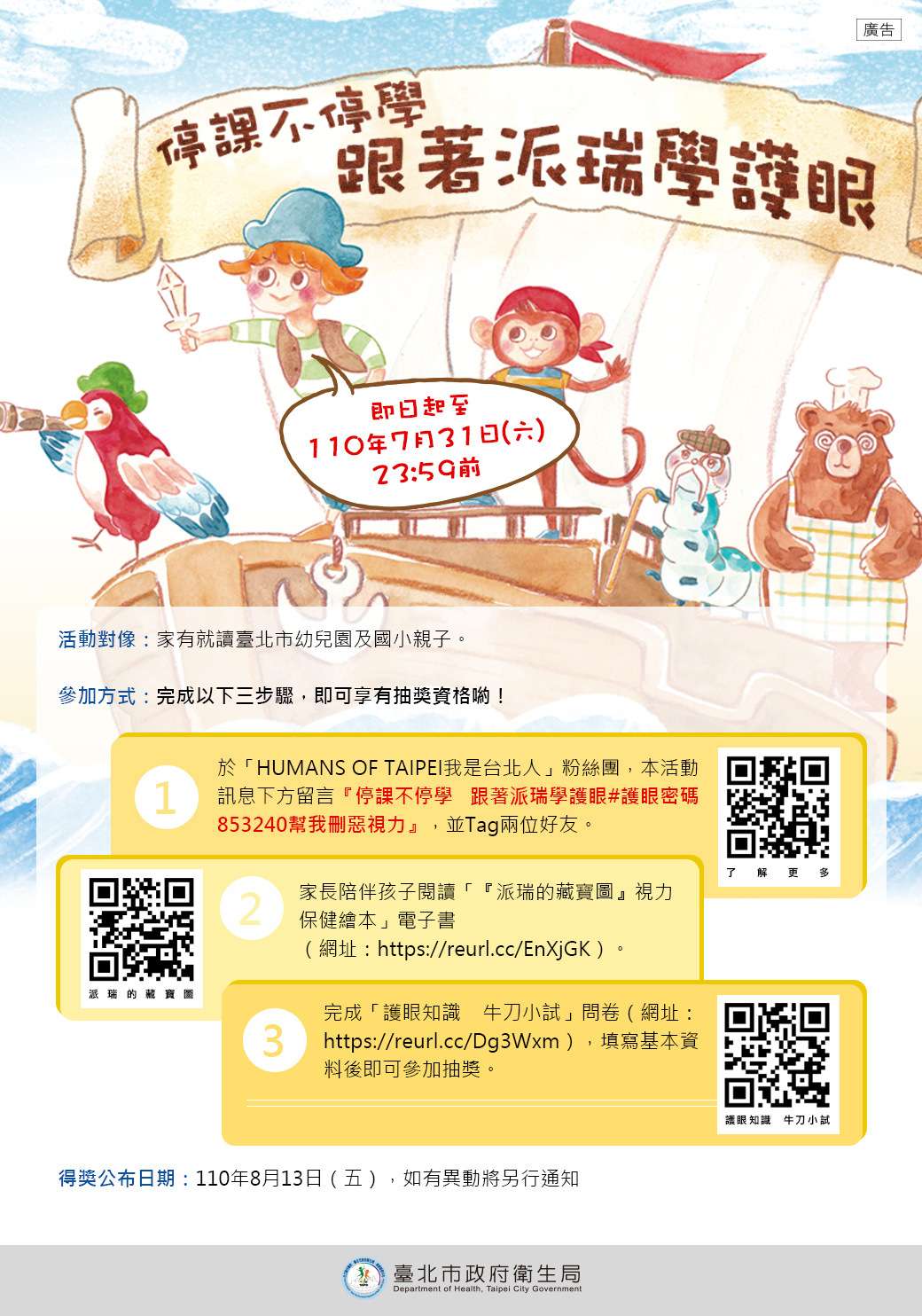 (三)參加方式:至臉書「Humans of Taipei 我是台北人」粉 絲專頁活動頁面,依步驟及範例留言、完成閱讀「派瑞 的藏寶圖視力保健繪本」電子書及答題後,即可參加抽獎。
