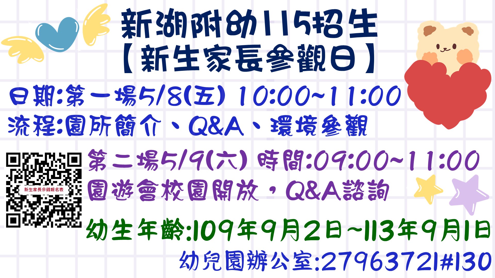 5/8(五) 會在會議室聽園所介紹,因活動內容孩子易感到無聊而難以久坐,建議此階段不安排孩子參與。為維護活動品質與孩子的舒適度,敬請家長協助配合與理解,感謝您的支持。