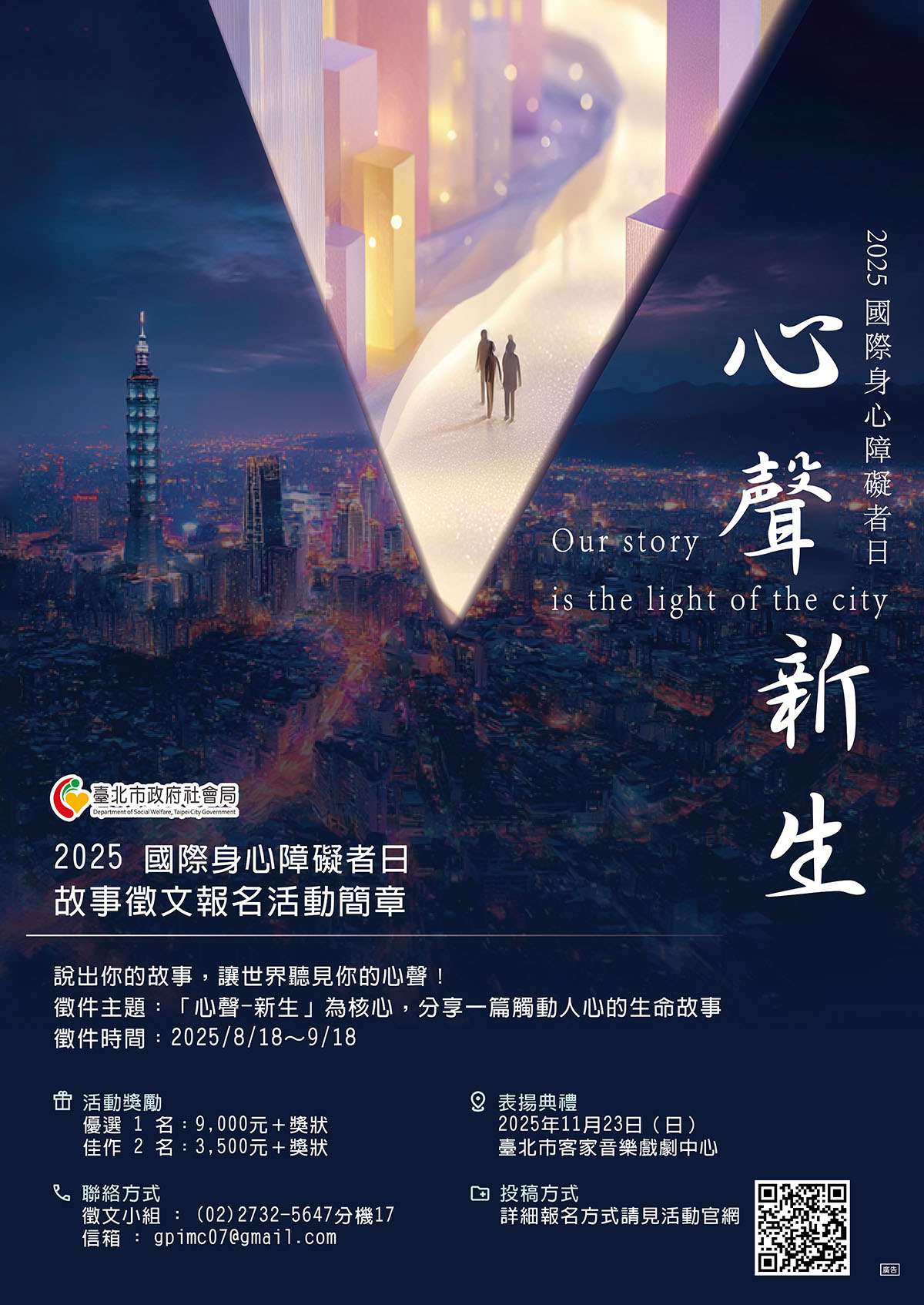 二、每年12月3日為聯合國訂定之「國際身心障礙者日」,本 局為促進社會大眾對身心障礙者權益之重視,本(114)年 度以「心聲-新生」為主題,擴大舉辦身心障礙者生命故事 徵件活動。