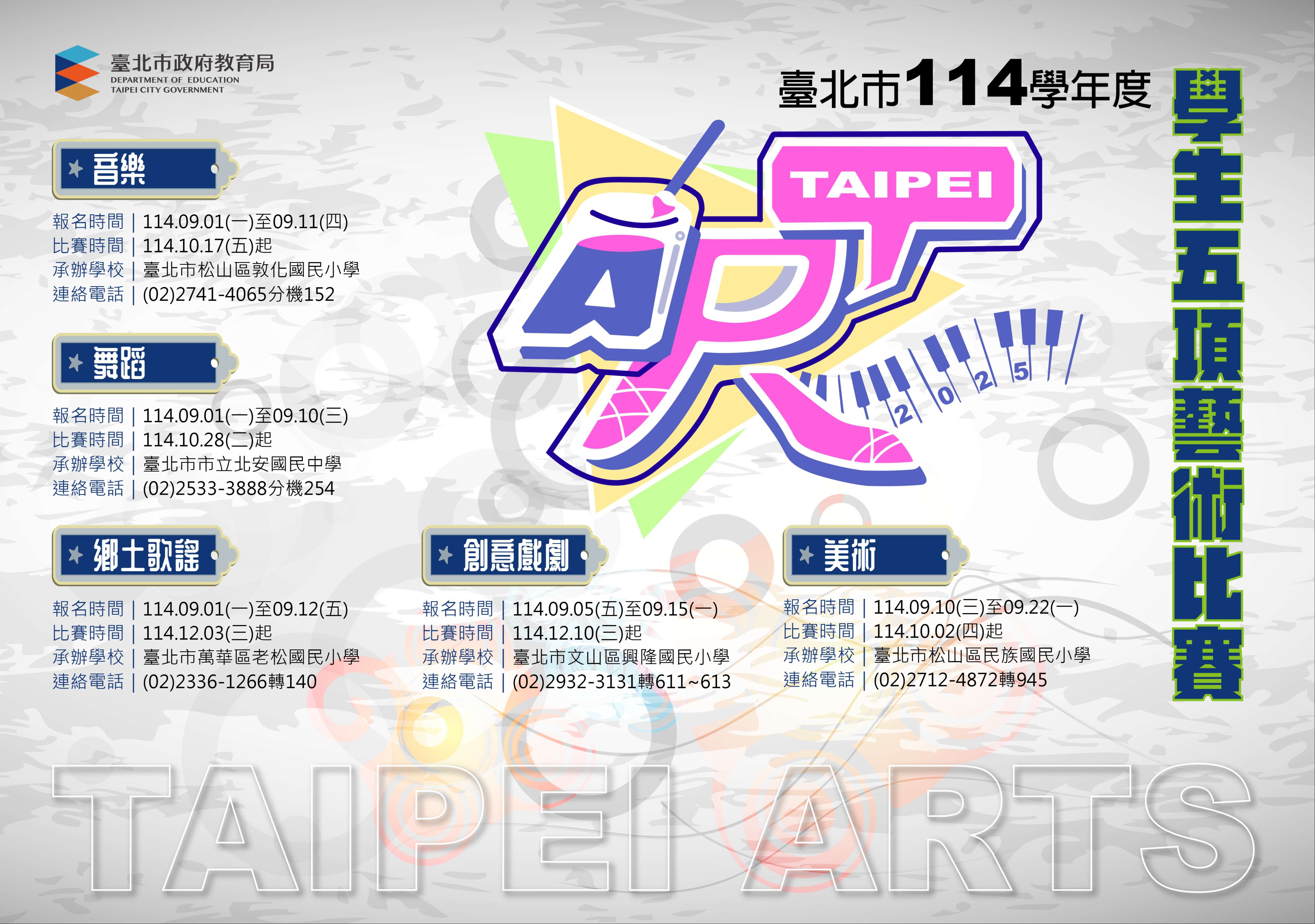 臺北市學生五項藝術(音樂、美術、舞蹈、創意戲劇及鄉土歌謠)比賽,9/1起陸續開放網路報名。相關訊息及作業時程,請至臺北市五項藝術比賽網站查詢,逾期不受理。