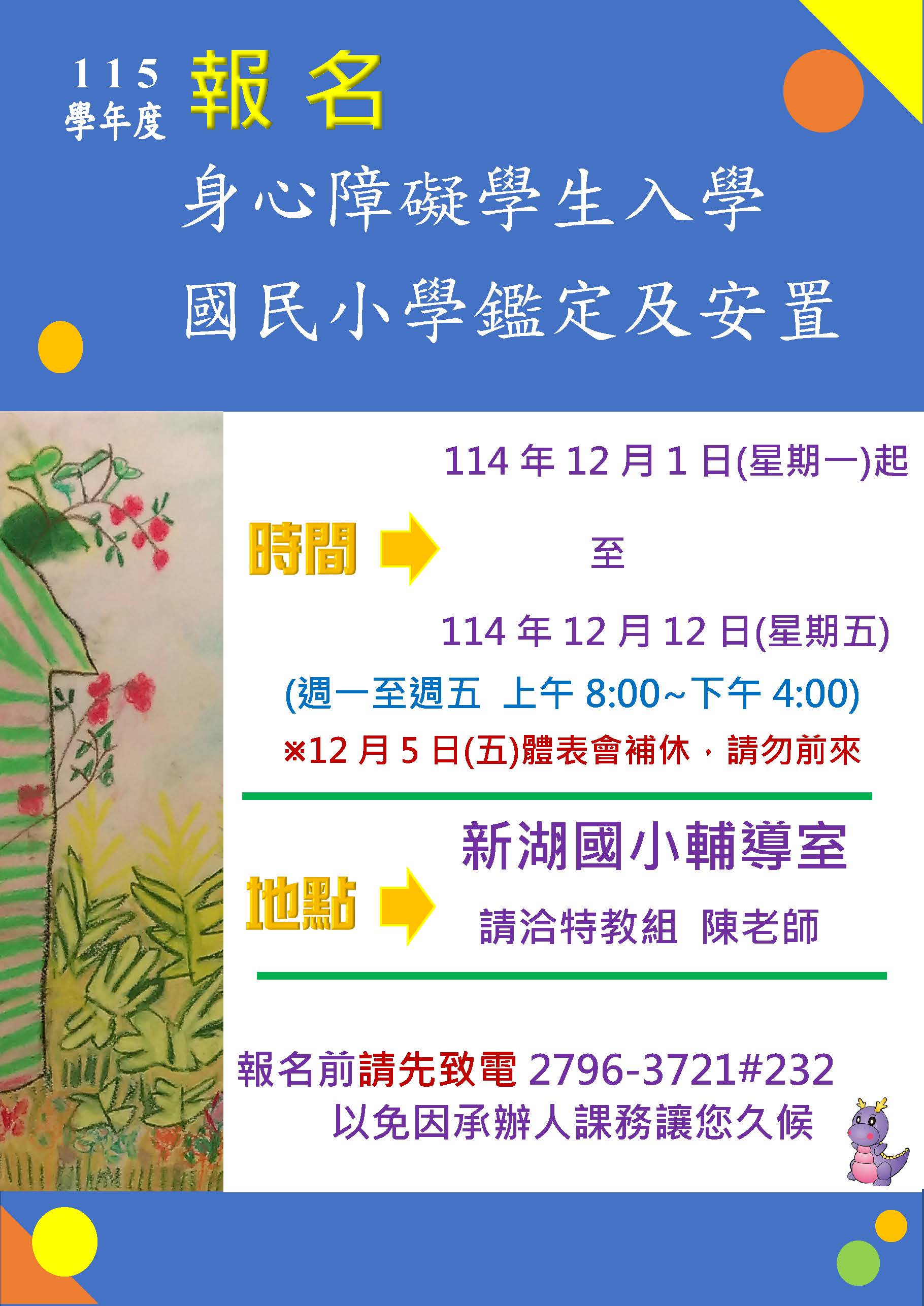 (三)學區學校受理報名:114年12月1日至114年12月12日(週一至週五上午9時至下午4時,假日不受理報名)。