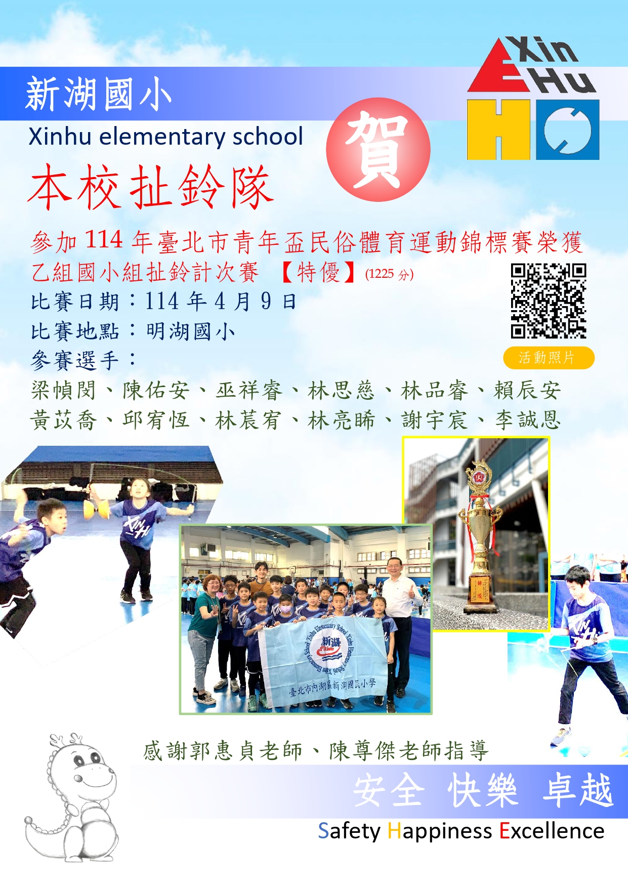 參加114年臺北市青年盃民俗體育運動錦標賽榮獲乙組國小組扯鈴計次賽 【特優】(1225分)